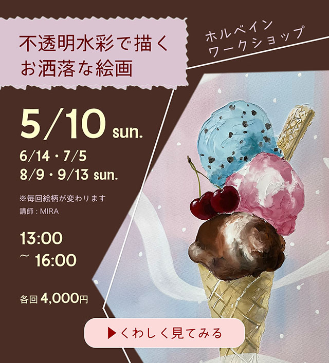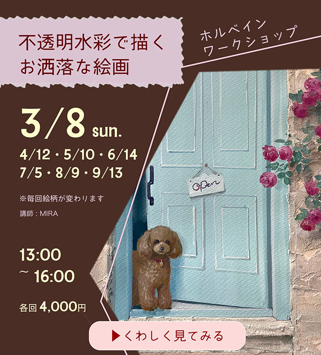 不透明水彩(ガッシュ)をメインに使った絵画の講師もしており、毎月1回ホルベインアートスペース(大阪・上本町)では、ガッシュや話題の画材を併用するなどしたワークショップ【不透明水彩で描くお洒落な絵画】で指導しています。