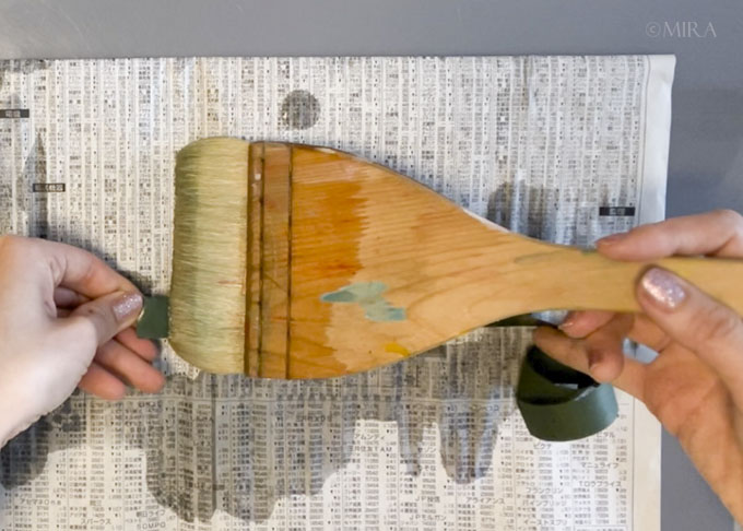 まずテープの糊面を上向きにして置き、端を片手で持ち、もう片方の手で濡らした刷毛をテープの端にそっと押し当てます。