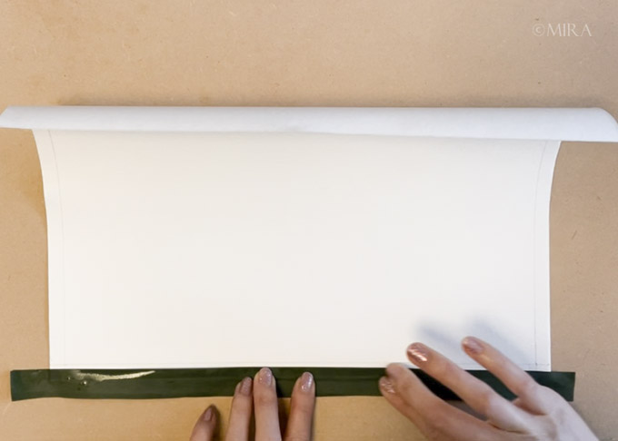 たわむことがないよう、まず左右の両端をナナメにシッカリ引っ張りながらとめ、次に真ん中も軽く手前に引きながらそっと押さえてとめます、先ほどと同じように真ん中から両端に向かってテープをシッカリ貼ります。