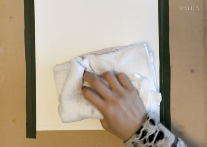 このときに紙が部分的にふくらんで気になるようなら、紙の中央から外側に向かってタオルでそっと空気を押し出すようにおさえてからとめます。