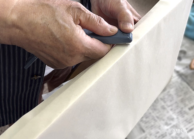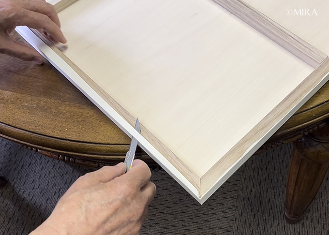 紙は外すときに絵を描いた部分がやぶれたり、キズを付けないように、四隅のスキマからカッターナイフを差し込んで切っていきます。