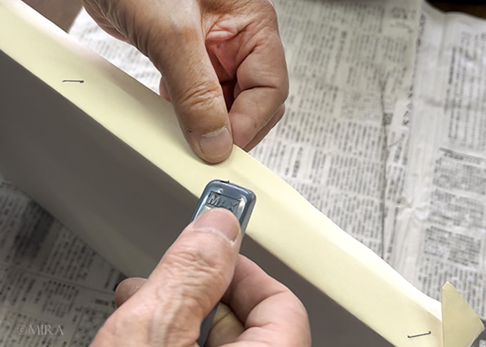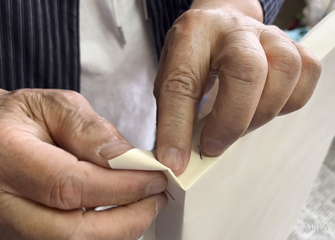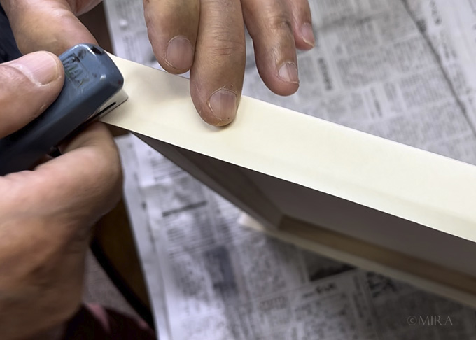紙と木製パネルをまとめて持ち、片側をテーブルにつけたままクルリと立ち上げ、木製パネルの角に沿わせて紙を折り、両端をホッチキスで留めます。
