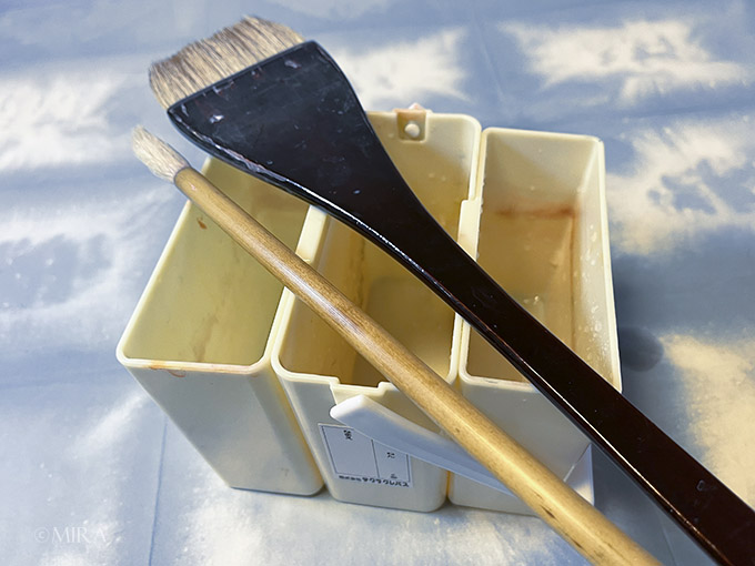 絵も初心者のうちは丸筆と面相筆くらいしか使わないことが多いので、黄色いバケツでじゅうぶん事足りるのですが、上達するにしたがって絵筆の種類も増え、刷毛は外せないアイテムになっていきます。