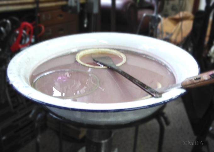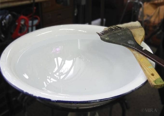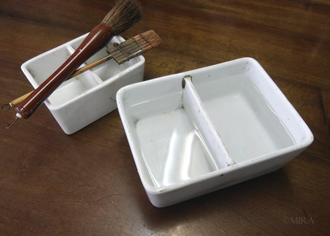 師匠はアンティークのホーローの洗面器を筆洗にしています。