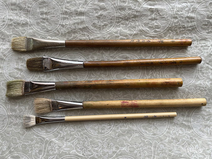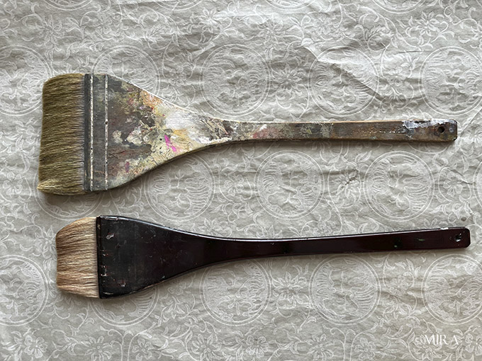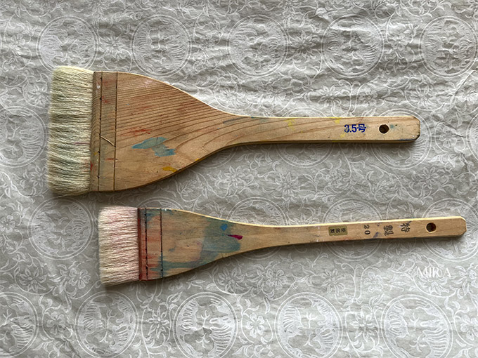 大きな絵になると上の刷毛が重宝しますが、中くらいの作品までなら下の刷毛でじゅうぶんです。