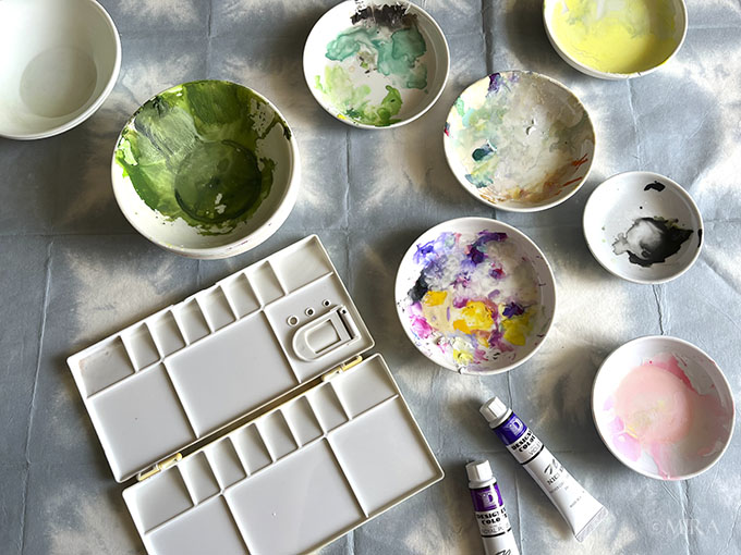 透明水彩の場合は固形タイプもチューブタイプもパレットに出して固め、パレットは洗わないで続けて使っていく方が多いですが、不透明水彩の場合はちょっと異なります。