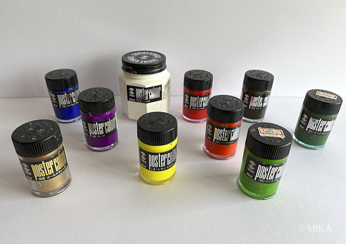 ポスターカラーとは不透明水彩絵の具の一種で、色の材料である顔料と顔料を紙に接着させるための材料にアラビアガムやデキストリンなどを使ったマットな質感の高発色な絵の具です。