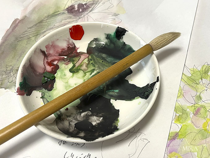 一方不透明水彩は下の色を覆い隠すため、基本はパレットの中で混色します。