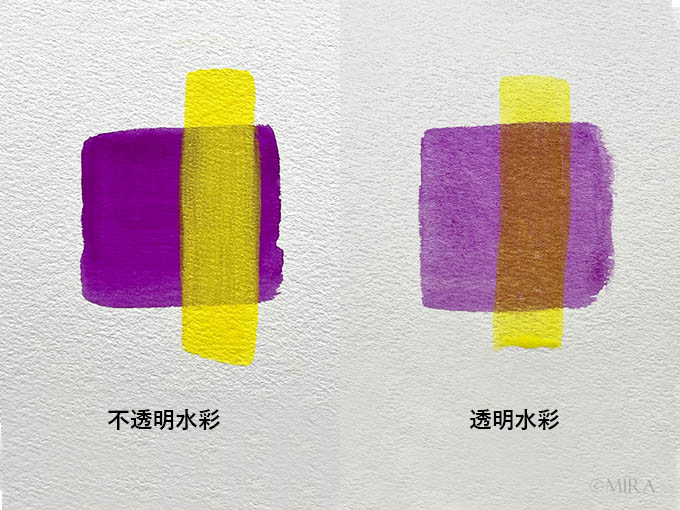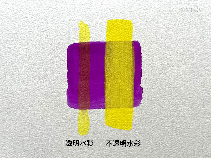 透明水彩と不透明水彩(ガッシュ)は文字通り、透明で下の色が透過する絵の具と、不透明で下の色を覆い隠す絵の具です。