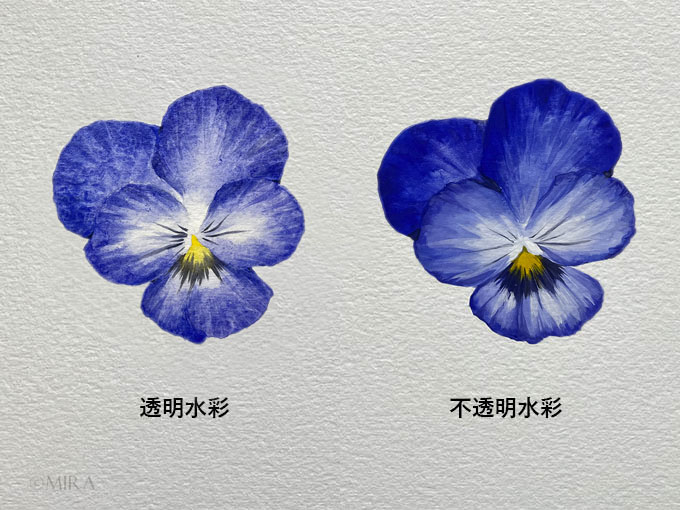 不透明水彩に水やメディウムを多めに混ぜれば透明水彩のように使え、透明水彩は白い絵の具を混ぜれば不透明(半不透明)になります。
