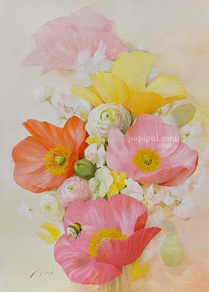 飛んでいるハチを描くには、透明水彩の場合はマスキングするなどして周りの花と描き分ける必要がありますが、これは不透明水彩なので、花の絵を描いた上に描き足しました。